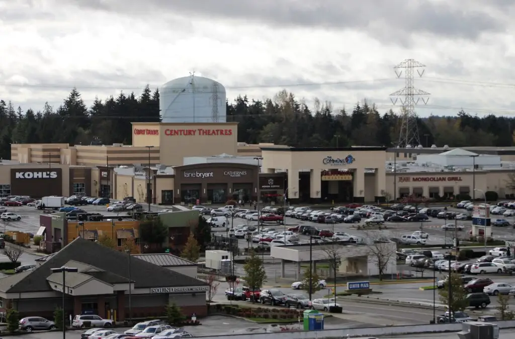 In 1955, Federal Shopping Way opened as the area’s first major shopping center, featuring not just retail stores but also Santafair amusement park rides and “Old World Square” – a unique collection of reproduced European buildings. The complex later included historic Pacific Northwest structures, including Seattle pioneer David Denny’s log cabin, making it a cultural landmark until its transformation in the 1990s.